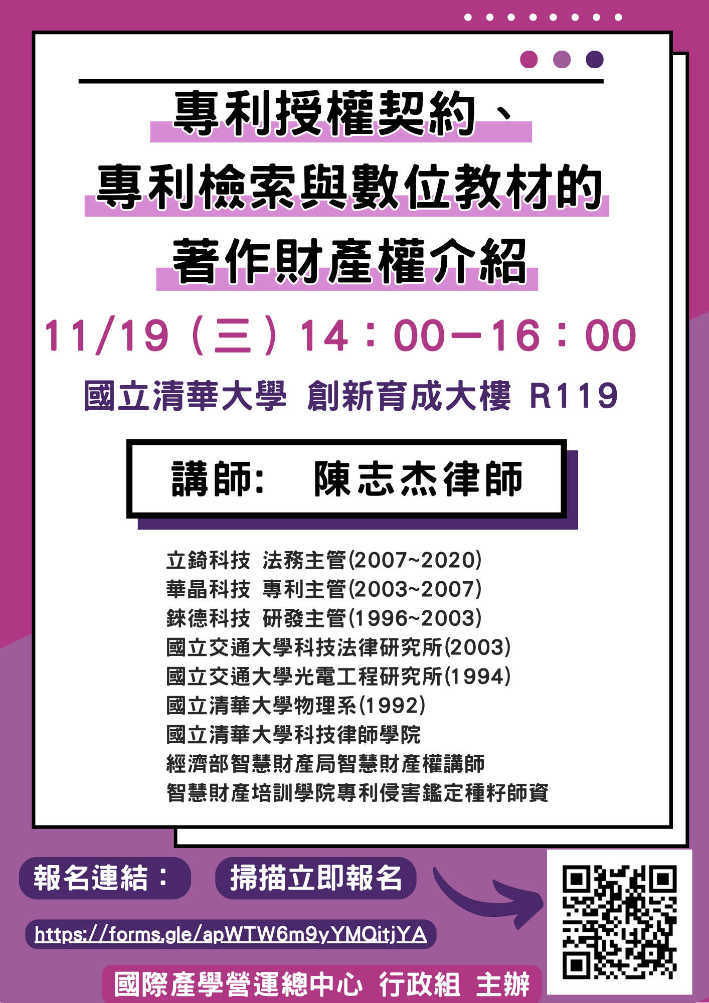 【演講報名】專利授權契約、專利檢索與數位教材的著作財產權介紹