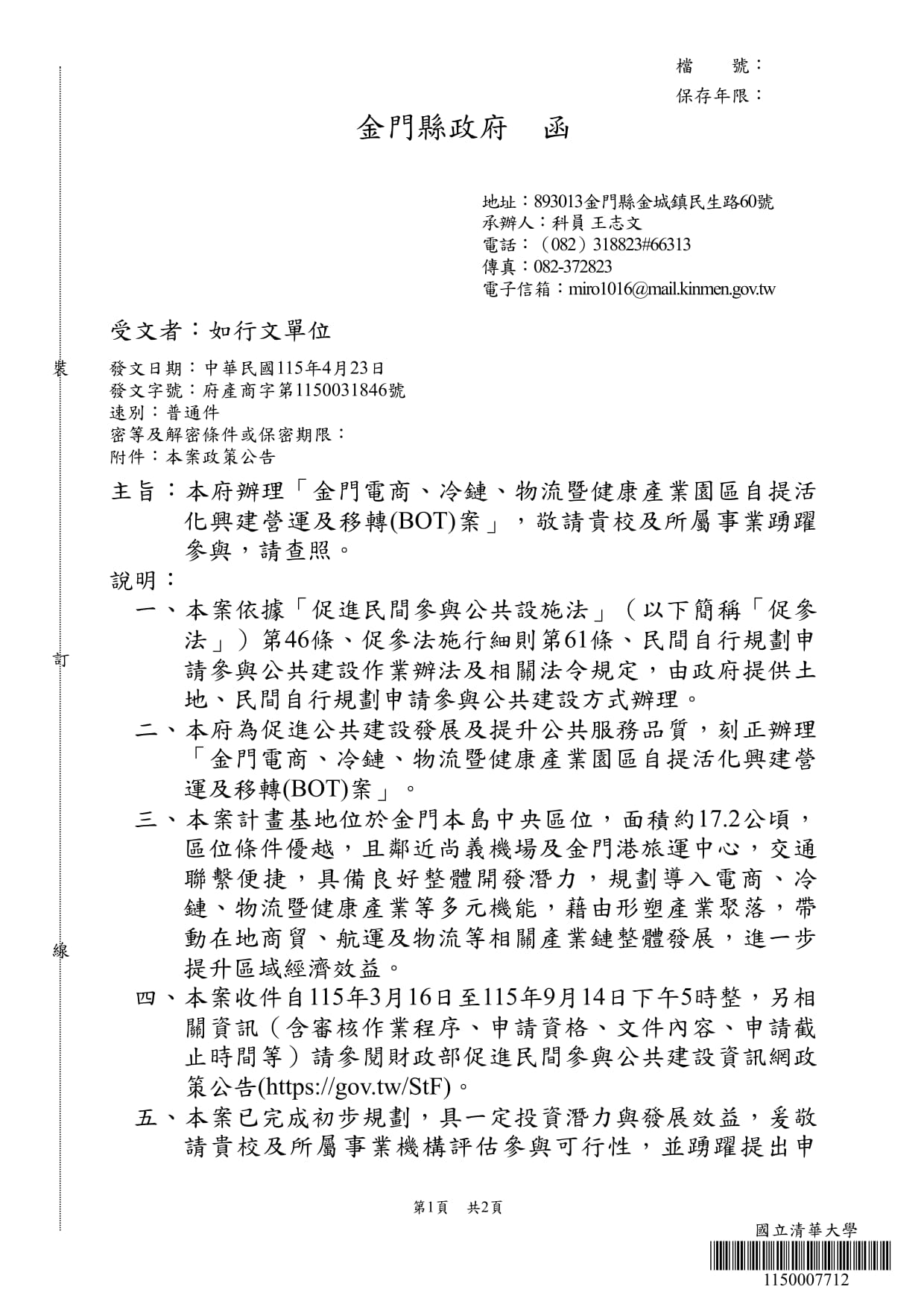 > 金門縣政府辦理「金門電商、冷鏈、物流暨健康產業園區自提活化興建營運及移轉(BOT)案」