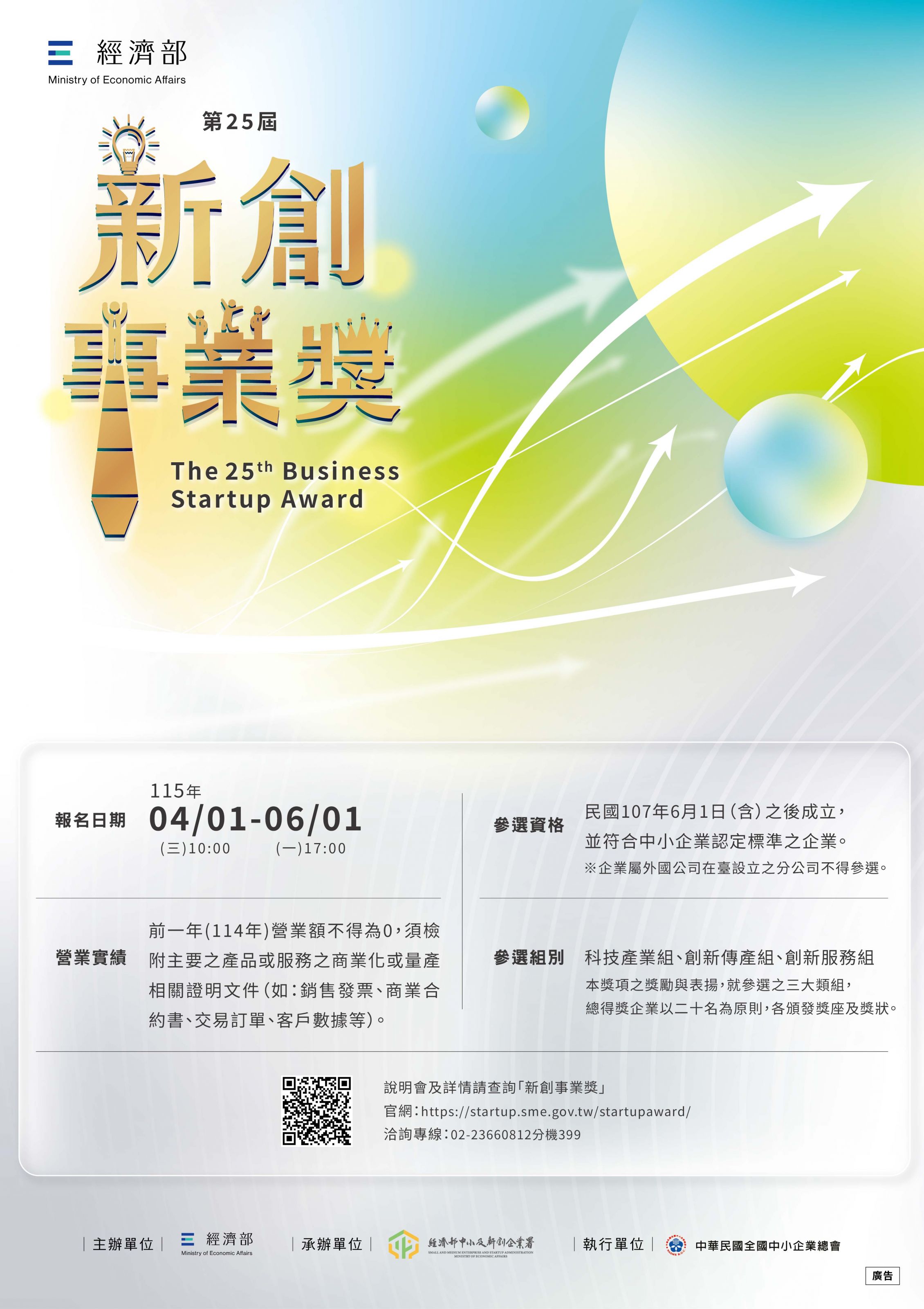 https://startup.sme.gov.tw/startupaward/,報名時間自即日起至6月1日下午5時止,參選資格為107年6月1日(含)之後成立並符合中小企業認定標準之企業,參選組別分為科技產業組、創新傳產組、創新服務組。